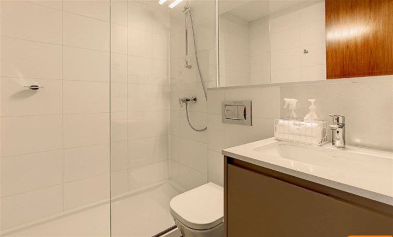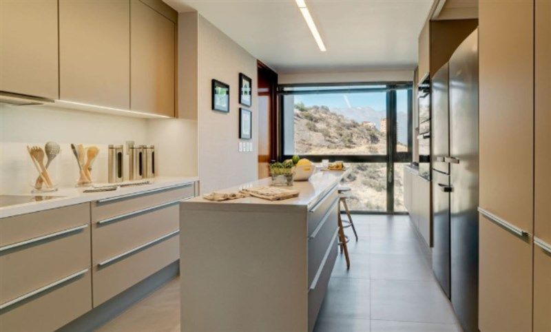 Amplio hall de acceso, baño de visita y cocina con mesón isla, encimera de vitrocerámica con 4 zonas de cocción, campana retráctil, horno eléctrico, microondas con grill y lavavajilla empotrada de acero inoxidable, espacio para loggia y dormitorio de servicio con baño.