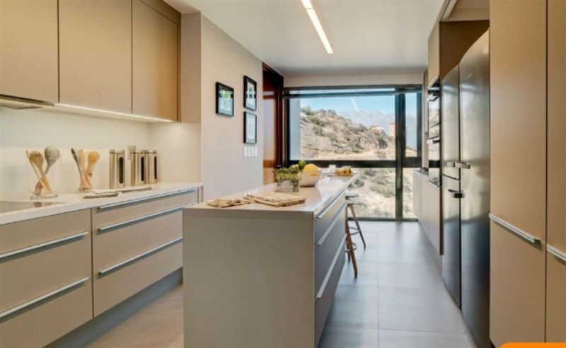 Amplio hall de acceso, baño de visita y cocina con mesón isla, encimera de vitrocerámica con 4 zonas de cocción, campana retráctil, horno eléctrico, microondas con grill y lavavajilla empotrada de acero inoxidable, espacio para loggia y dormitorio de servicio con baño.